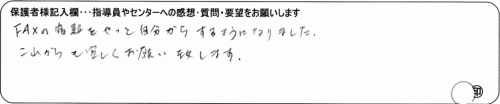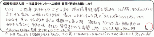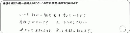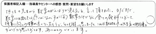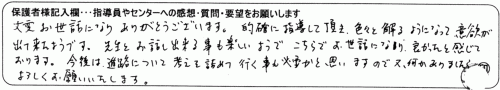 大変お世話になりありがとうございます。的確に指導して頂き、色々と解るようになって意欲が出てきたようです。
