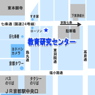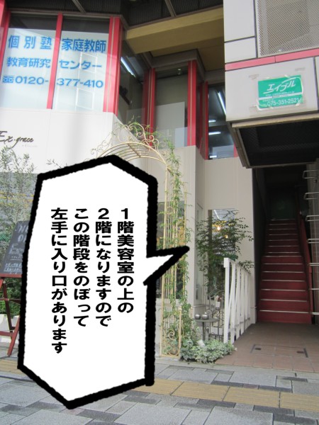 京都タワーの下、烏丸通りを北へ上がってください。七条通り(ローソン、すき家が角にあります)まで来たら、東へ曲がって下さい(右手の方向)。ローソン側にあります、1F 美容室の二階です。